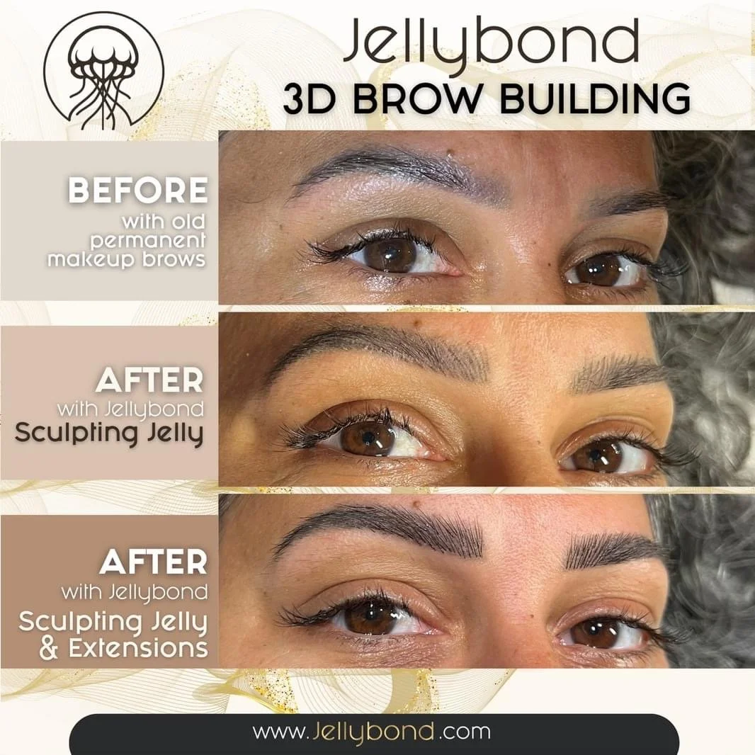 Jellybond is a non-invasive brow system designed to create semi-permanent 3D textured eyebrows. The medical-grade, flexible gel-like adhesive replicates hair strokes where none exist. Perfect for a sculpted or fluffy look & to cover discolored permanent makeup or freshen the look between sessions. Actual hair may also be applied, finally an option to provide a full brow for those without hair! It is not a tint, dye, stain or Henna! Enjoy Brows that last up to 2-4 weeks with proper applicatinon and aftercare! There is literally nothing like it!